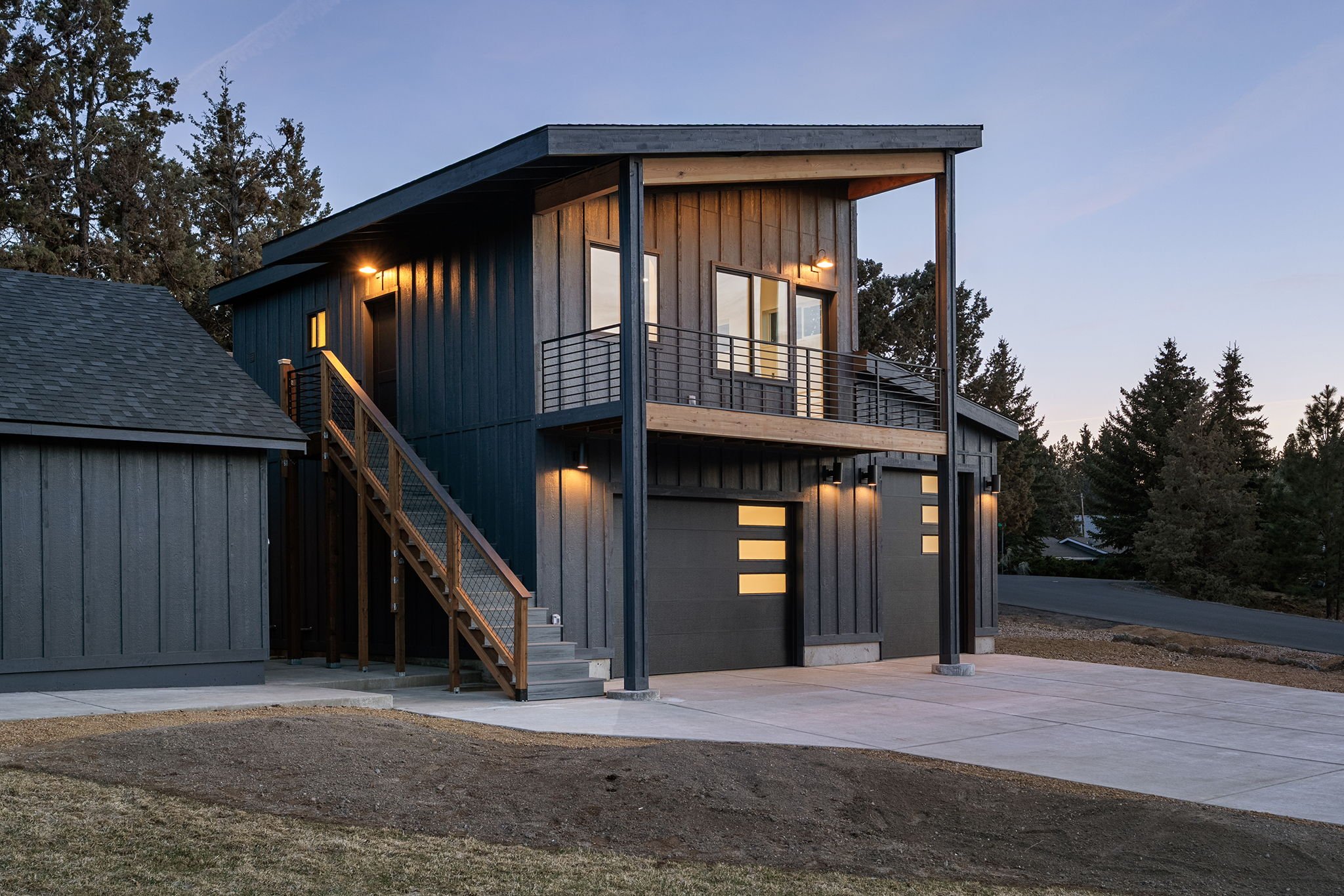 Close-up of modern building porch with black vertical wooden slats, a green door with three glass panels, and large windows, illuminated by two ceiling lights at dusk.